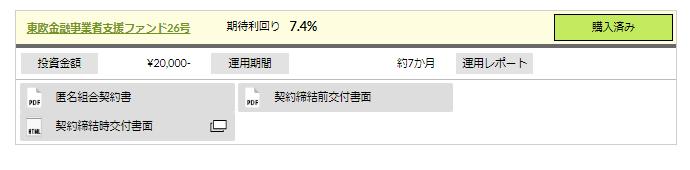 明日以降、営業者に申込金額を送金した後でマイページに表示されている[東欧金融事業者支援ファンド26号]に「契約締結時交付書面」を発行致しますのでご確認ください。