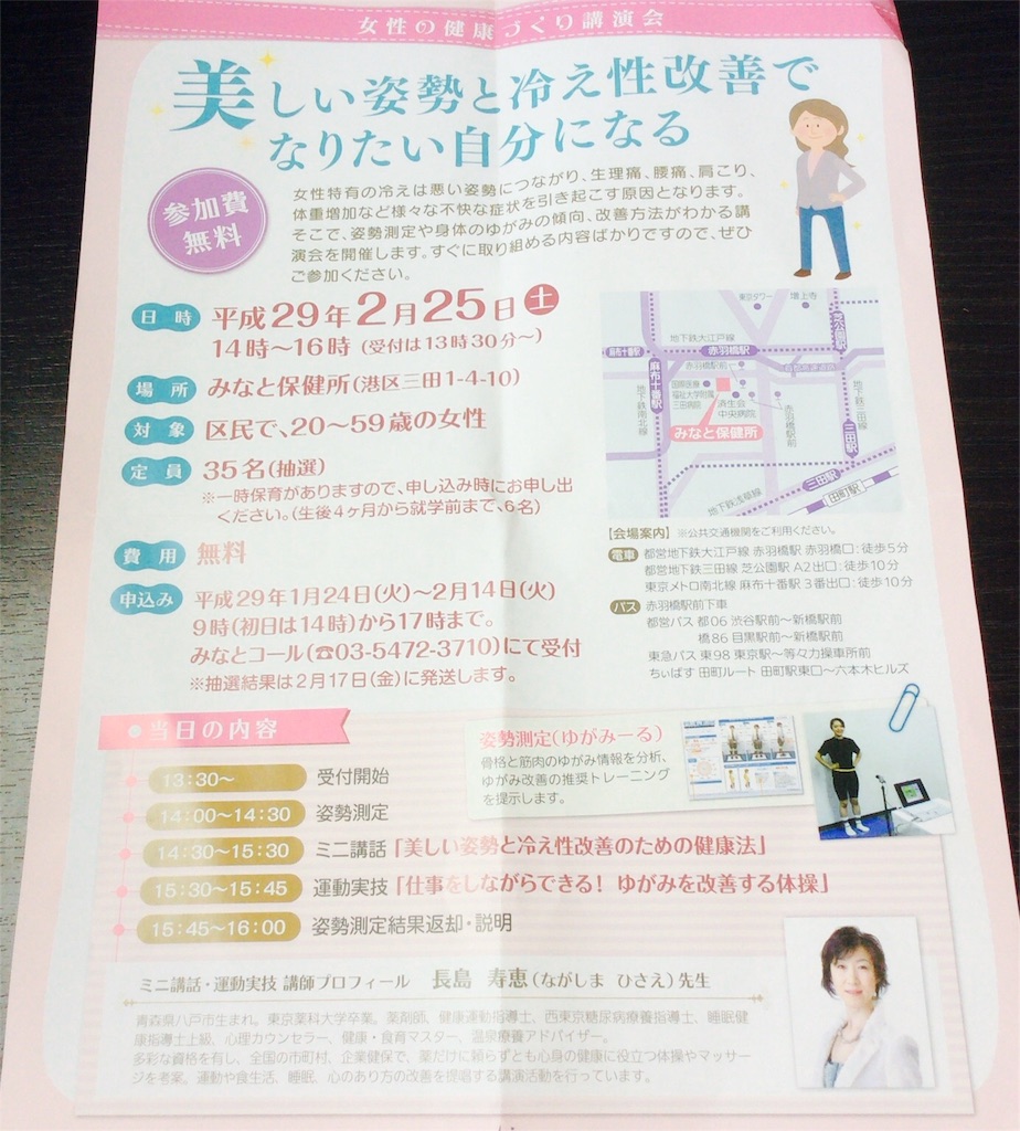 この間の週末は港区にある「みなと保健所」で開催された 「美しい姿勢と冷え性改善でなりたい自分になる」に参加してきました~(*´ω`*) こちらのチラシは港区の図書館でGET。 こういう地元の情報はサイトに載ってなかったりするので、アナログで手に入... -